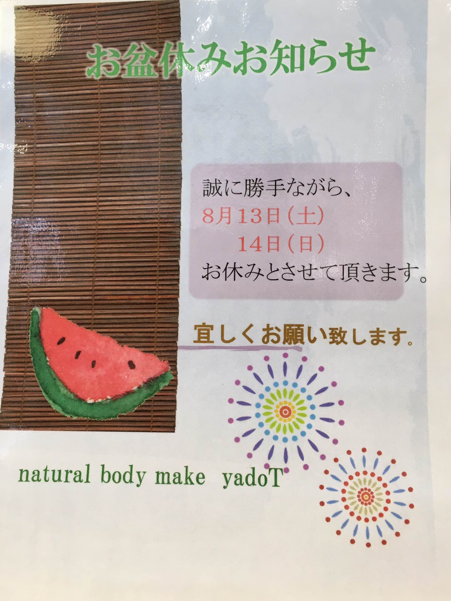 2016.07.23 お盆休みのお知らせ 皆さまこんにちは。 梅雨が過ぎ 海の日が過ぎ 本格的な夏がやってきました。 こまめな水分補給と塩分の摂取をして 熱中症にならないようにお気を付けください。 さて今日は【yadoT】のお盆休みについてお知らせいたします。 8月13日(土) 8月14日(日) 以上の2日間をお休みさせて頂きます。 8月15日(月)からは通常営業になりますので宜しくお願い致します。 natural body make yadoT motoyoshi 一覧に戻る
